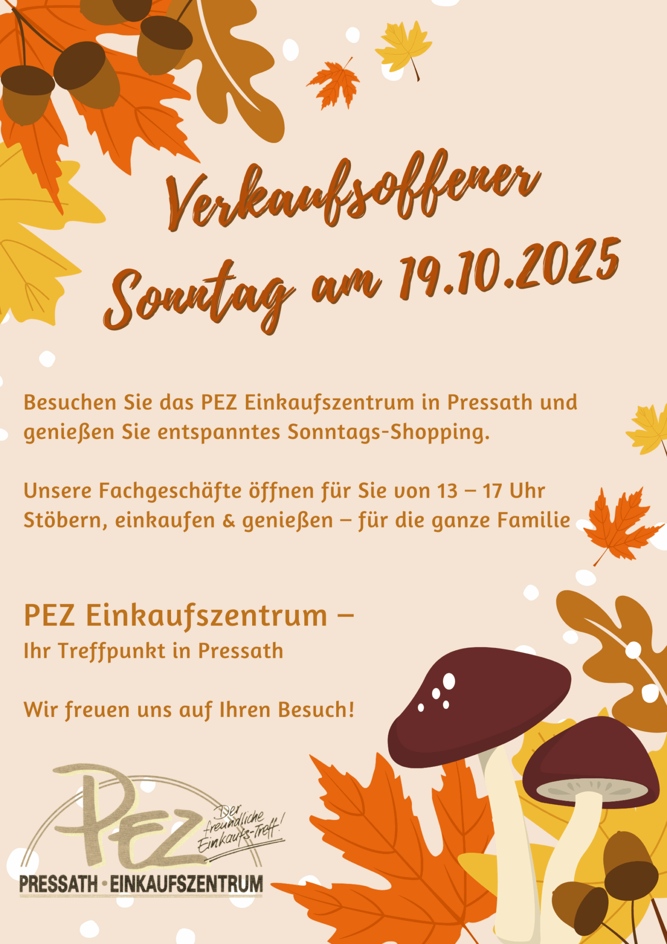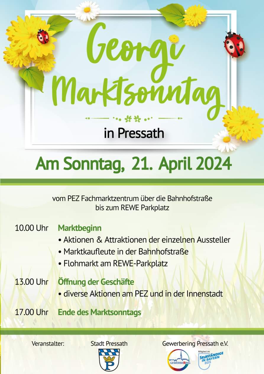 Ab 10 Uhr – Marktbeginn am Rathausplatz – Flohmarkt am REWE-Parkplatz. Ab 13 Uhr – Öffnung der Geschäfte – diverse Aktionen am PEZ und in der Innenstadt. – Blaulichttag der Feuerwehr Pressath 17 Uhr – Marktende