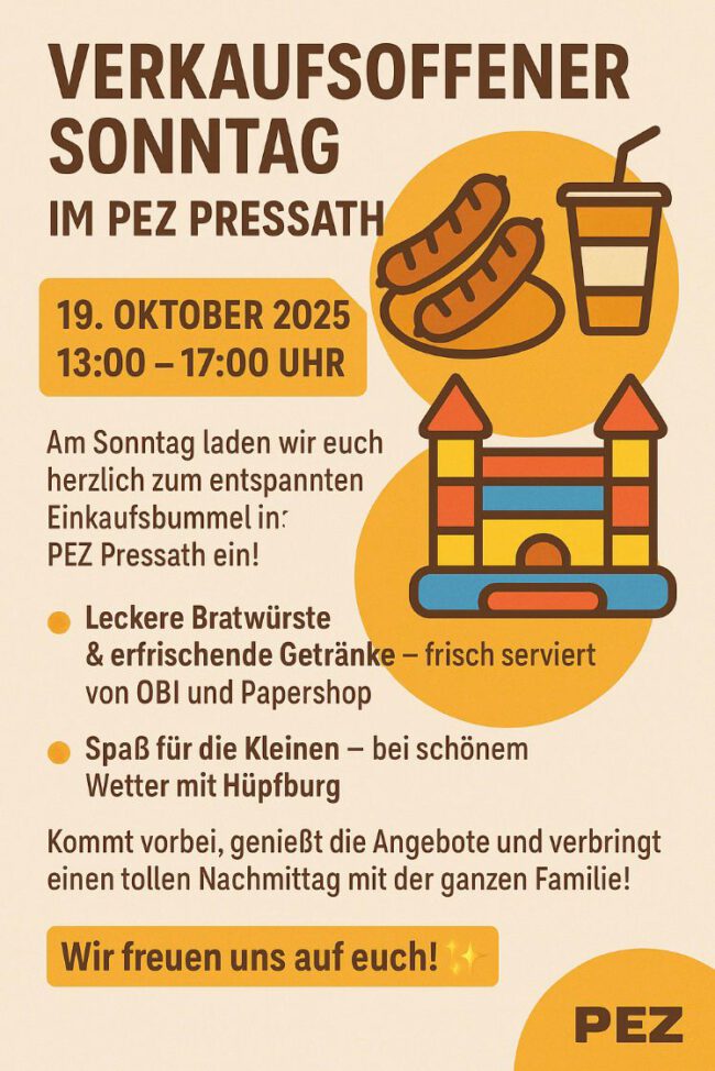 Ab 10 Uhr – Marktbeginn am Rathausplatz – Flohmarkt am REWE-Parkplatz. Ab 13 Uhr – Öffnung der Geschäfte – diverse Aktionen am PEZ und in der Innenstadt. – Blaulichttag der Feuerwehr Pressath 17 Uhr – Marktende